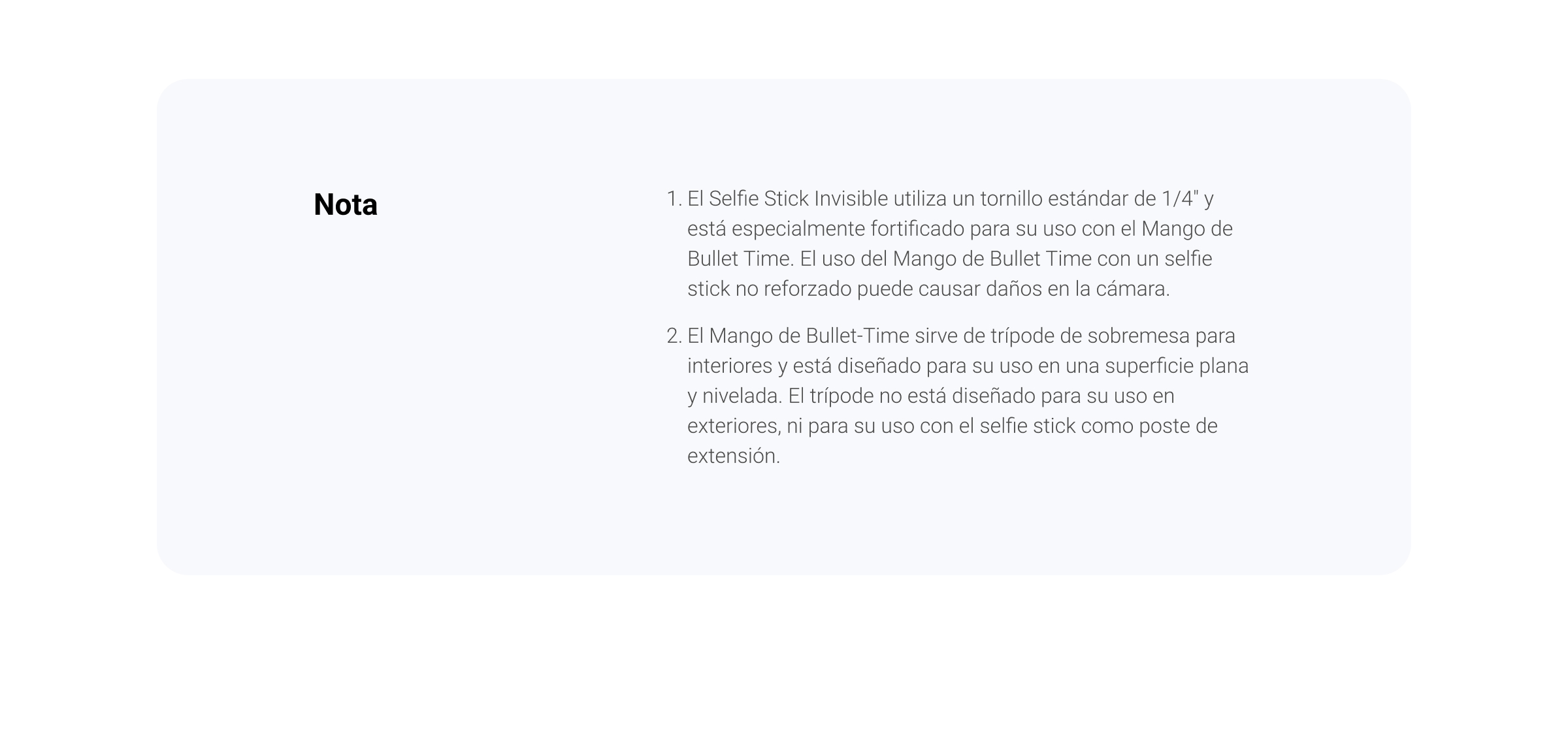 - El Trípode Bullet Time se dobla como un trípode de sobremesa de interior. El trípode no está diseñado para uso de exterior, o para uso con el selfie stick como un poste de extensión.