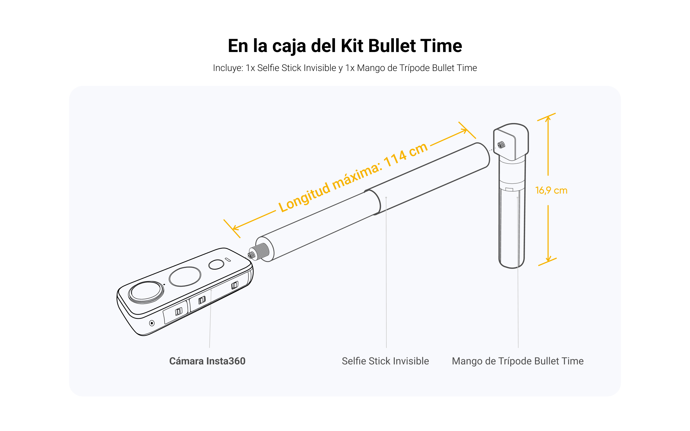 - El kit incluye 1x Trípode Bullet Time y 1x Selfie Stick.