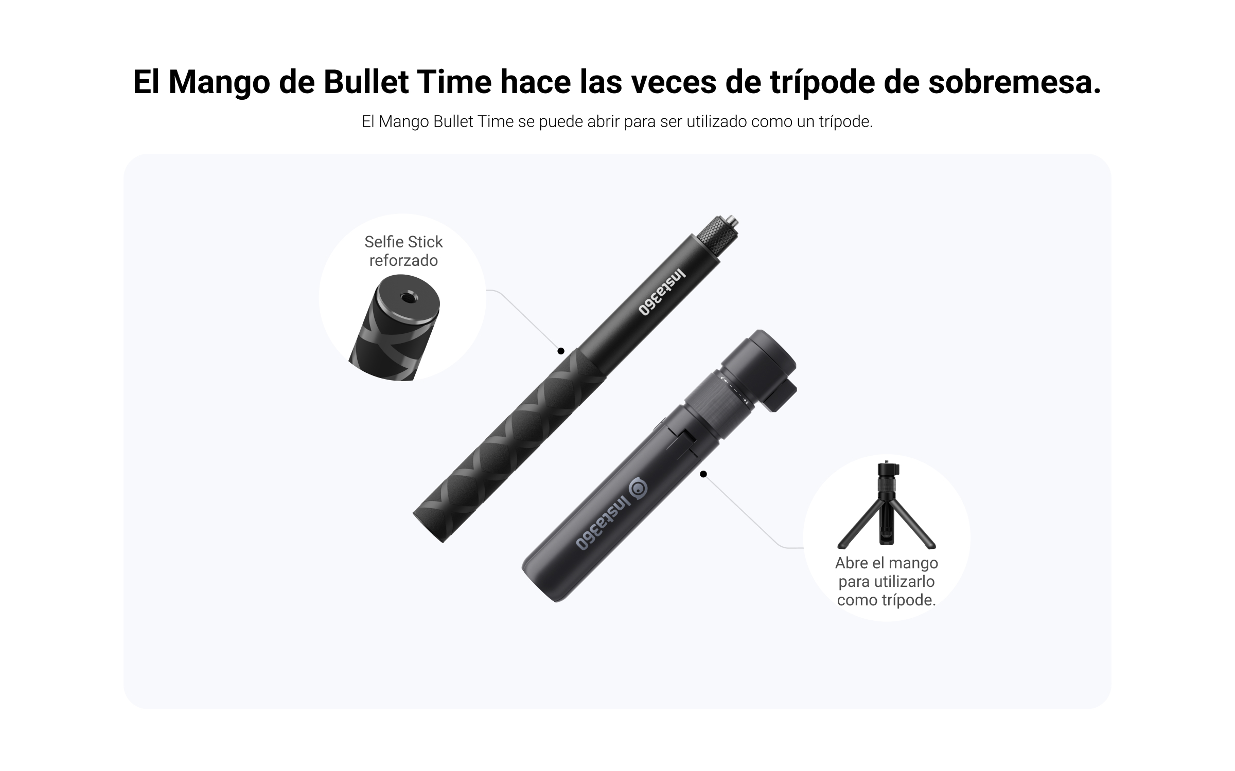 - El Mango del Trípode de Bullet Time con agarre sirve como trípode de mesa o como agarre para hacer rotar la cámara alrededor tuyo.