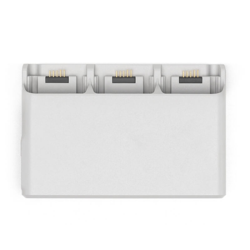 • Permite almacenar y cargar baterías. Al usarlo con el cargador portátil DJI de 65 W, puede cargar tres Baterías de Vuelo Inteligente simultáneamente en tan solo 60 minutos.