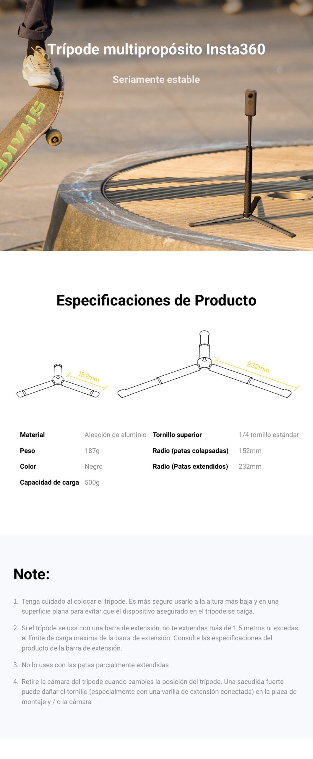 - Muy estable con patas extensibles.